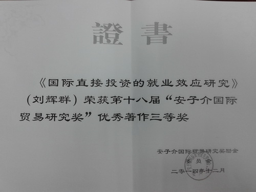 “安子介国际贸易研究奖”是由已故全国政协副主席、社会活动家、香港著名实业家安子介先生于 1991 年出资设立,并被教育部确定为部级奖。作为中国世界经济与国际贸易两个应用经济学二级学科的最高学术研究奖,现设“安子介国际贸易优秀著作奖”、“安子介国际贸易优秀论文奖”和“安子介国际贸易学术鼓励奖”。该奖项每两年评选一次,在国内外具有较大影响力。本届“安子介国际贸易研究奖”由近三十名海内外国际贸易领域知名专家担任评委,最终评出优秀著作奖 8 部,其中一等奖空缺,二等奖 3 部,三等奖 5 部;优秀论文奖 20 篇,其中一等奖 1 篇,二等奖 4 篇,三等奖 15 篇。刘辉群副教授的专著从众多优秀科研成果中脱颖而出,再次展现了Beat365青年教师的科研实力,也体现出Beat365唯一官方网站和国贸系多年来对青年教师提升科研能力给予的鼓励与支持。这是Beat365教师首次获得该奖项。