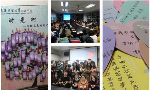 本次活动共分为五个环节,第一个环节是“点滴关爱 —— 来自冬日的礼物”,学院为每位同学发放了两本励志书籍,随书附赠励志卡片,为同学们送上精神上的支持与温暖;第二个环节“励志励学 —— 我曾这样走过”,播放了励志视频《筑梦起航》,帮助同学们树立大学目标,激励同学们的奋斗精神; 第三个环节“助梦希望 —— 让我说给你听”,学院邀请了多位优秀学生代表分享大学中学习与工作经验,魏莹同学向同学们讲述了自己成功的学习经验与方法,鼓励大家秉持良好的学习态度;蔡笑雨同学用精辟活泼的语言鼓励同学们“在大学,做最好的自己 ” ,学会接受,学会感恩;代家顺同学则从班级工作、社团活动、人生感受等方面与同学们进行了交流;第四个环节“互勉共进 —— 送给身边的你”,同学们将心中的感想化作文字的力量写在卡片上互相交换,相互鼓励;最后一个环节“放飞梦想 —— 通往未来的时光树”,播放了大四优秀学姐学长们对新生方向性的指引,大家在书签上写上了自己未来的奋斗目标,挂在时光树上,以此自我激励。