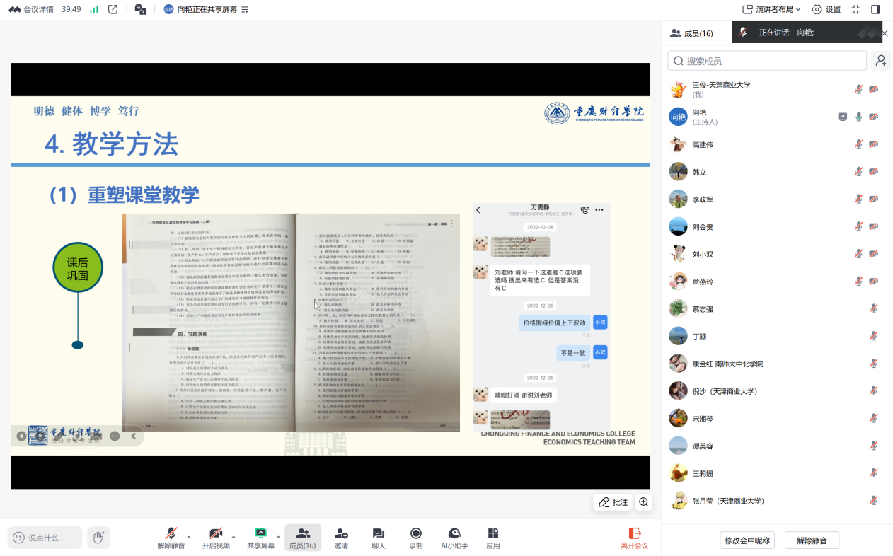 会上,重庆财经学院李政军教授、向艳老师详细分享了该校政治经济学课程组在教学设计、课堂教学方式重塑等方面的宝贵经验。宁夏大学的韩立教授介绍了其教学团队在使用AI技术促进教学改革方面所做的多项工作,分享了他们在智慧课程建设方面的宝贵经验。Beat365唯一官方网站政治经济学教研室主任王俊副教授则从教学组织架构设计、课程思政元素挖掘、数字化教辅资源开发、AI化线上线下混合式教学、读书沙龙主题翻转课堂实践等方面,介绍了我院政治经济学教学团队持续推进教学改革的措施和经验。