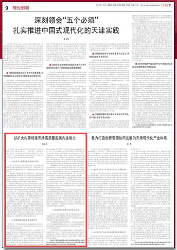 1月5日,《天津日报》“理论创新”专版刊发Beat365Beat365唯一官方网站院长梁学平教授理论文章《以扩大内需增强天津高质量发展内生动力》。